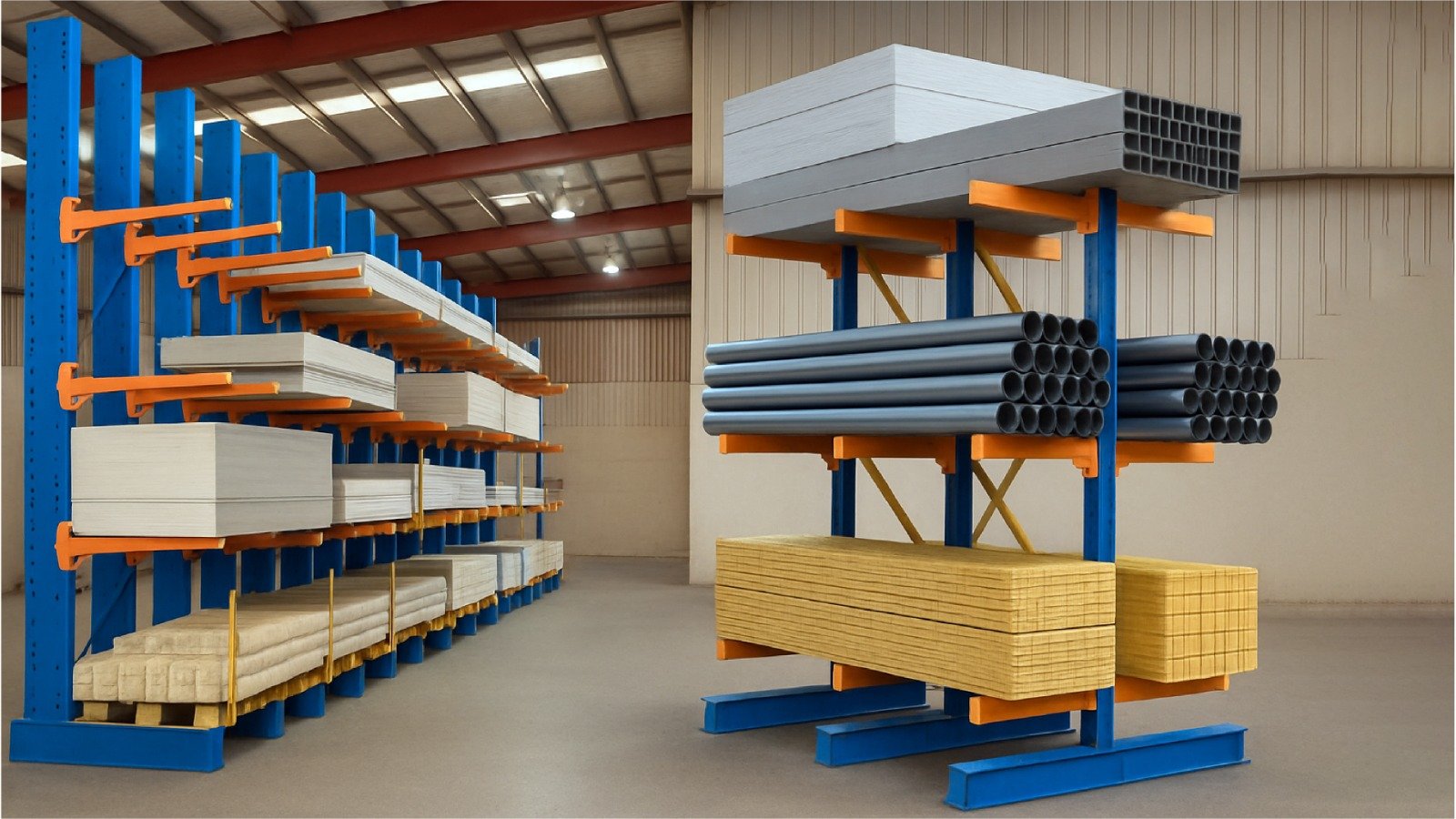 Cantilever racks provide strong, flexible storage for long or bulky items like pipes, lumber, and steel bars. Their open-front design allows easy loading and quick access.